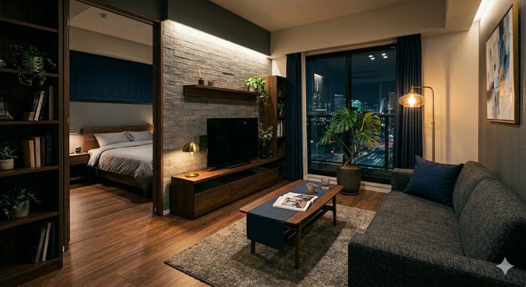 横浜の1LDKは家賃8〜12万円台。築浅にこだわらなくても、照明と色の統一だけで見違えます。寝室を隠せるだけで人を呼ぶハードルが一気に下がりますよ。
